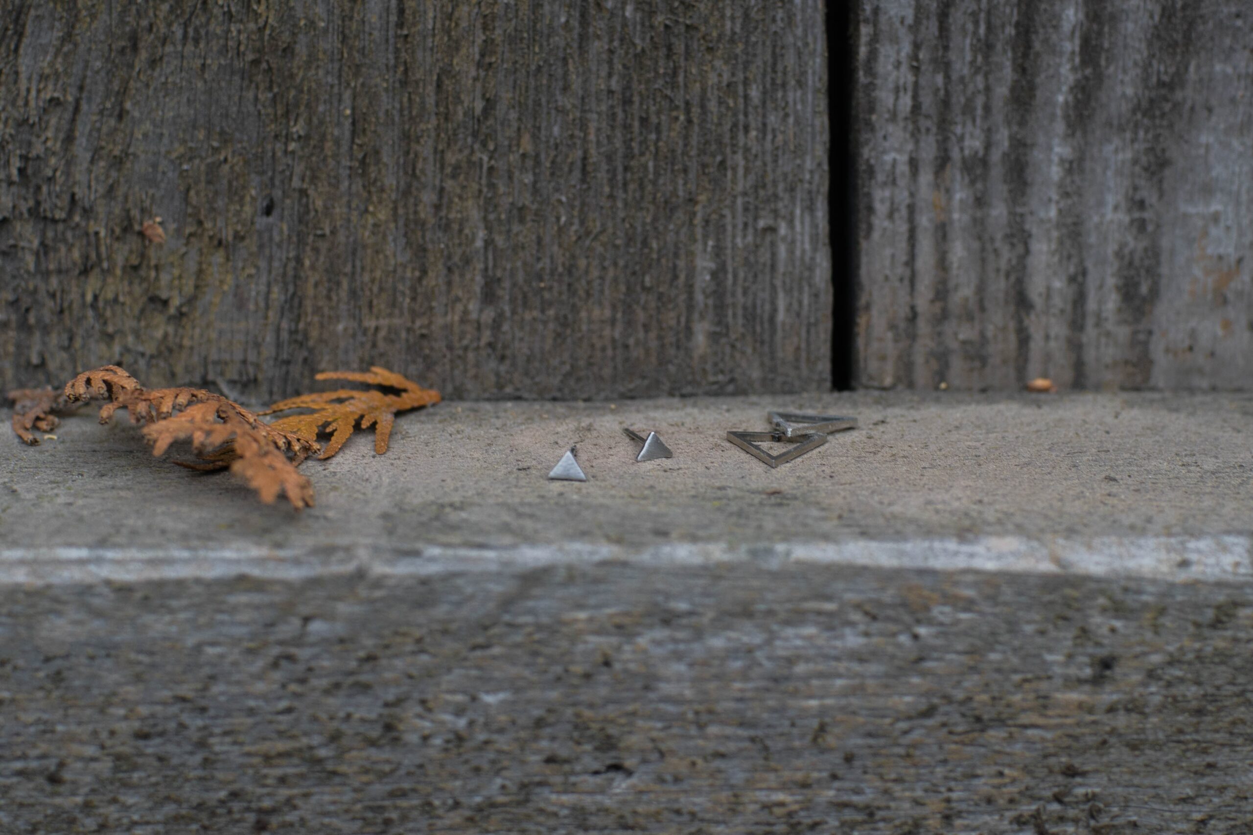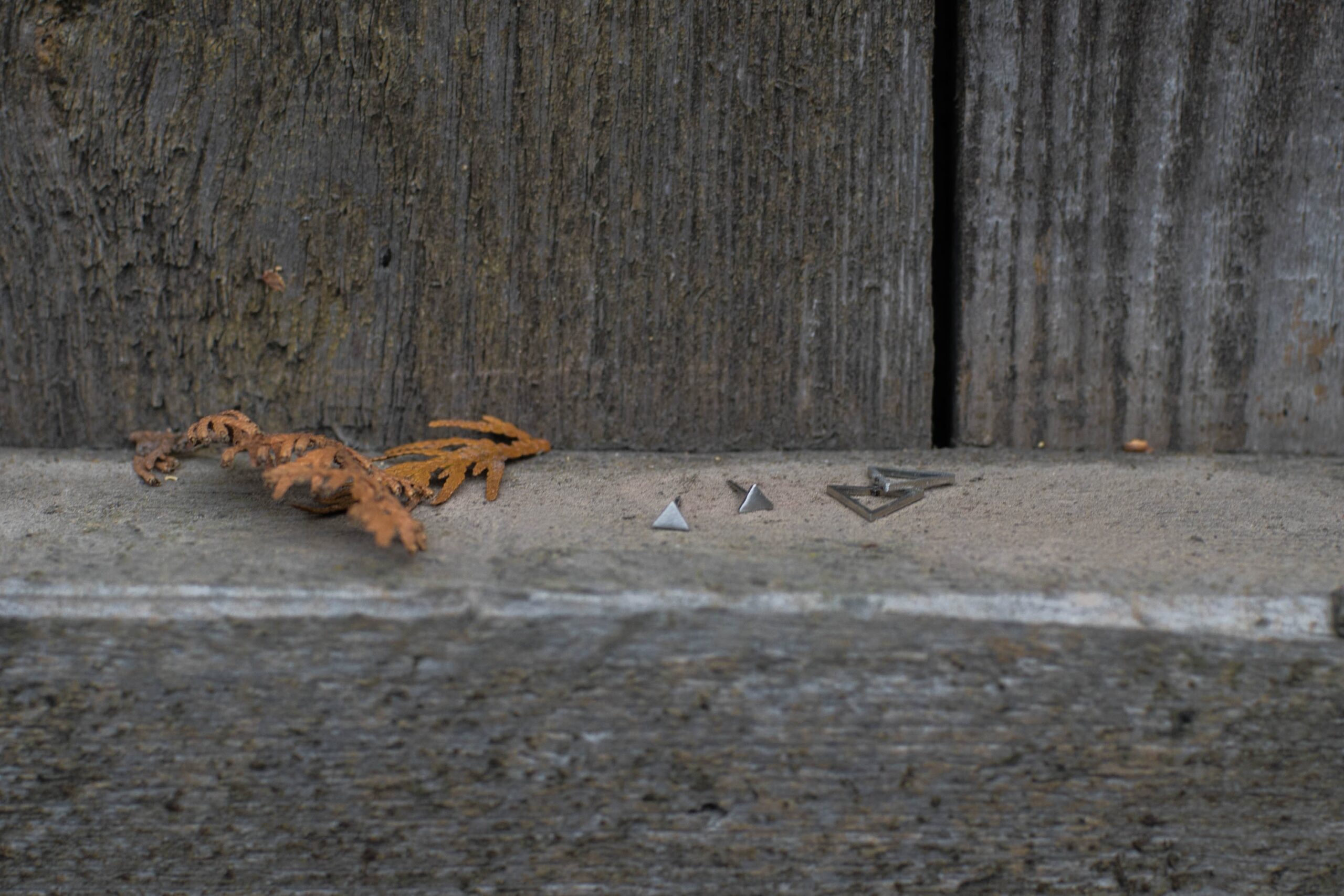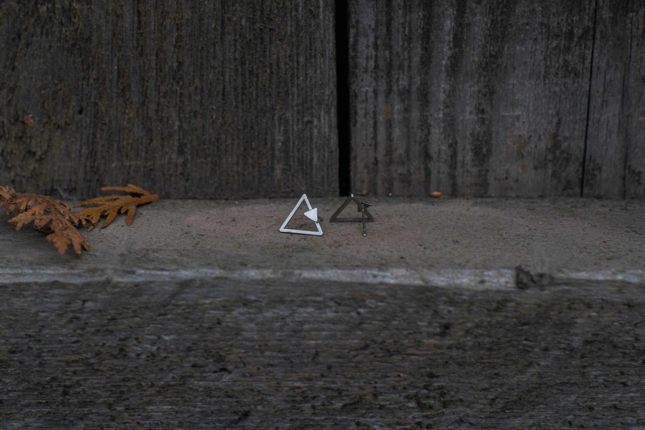 Náušnice jsou vyrobené z nerezové oceli, jejich rozměr je 11 x 11 mm. Nerezová ocel je materiál, který se vyznačuje hlavně svou pevností, stálostí a houževnatostí. Její hlavní výhoda však je, že se jedná o antialergenní materiál, takže se nemusíte bát alergických reakcí. Náušnice se dají nosit třemi způsoby. Obě části mohou být vepředu, menší trojúhelník může být vepředu a větší vzadu za uchem a nebo lze nosit jen malý trojúhelník samostatně. Náušnice jsou doplněny nerezovými zarážkami.