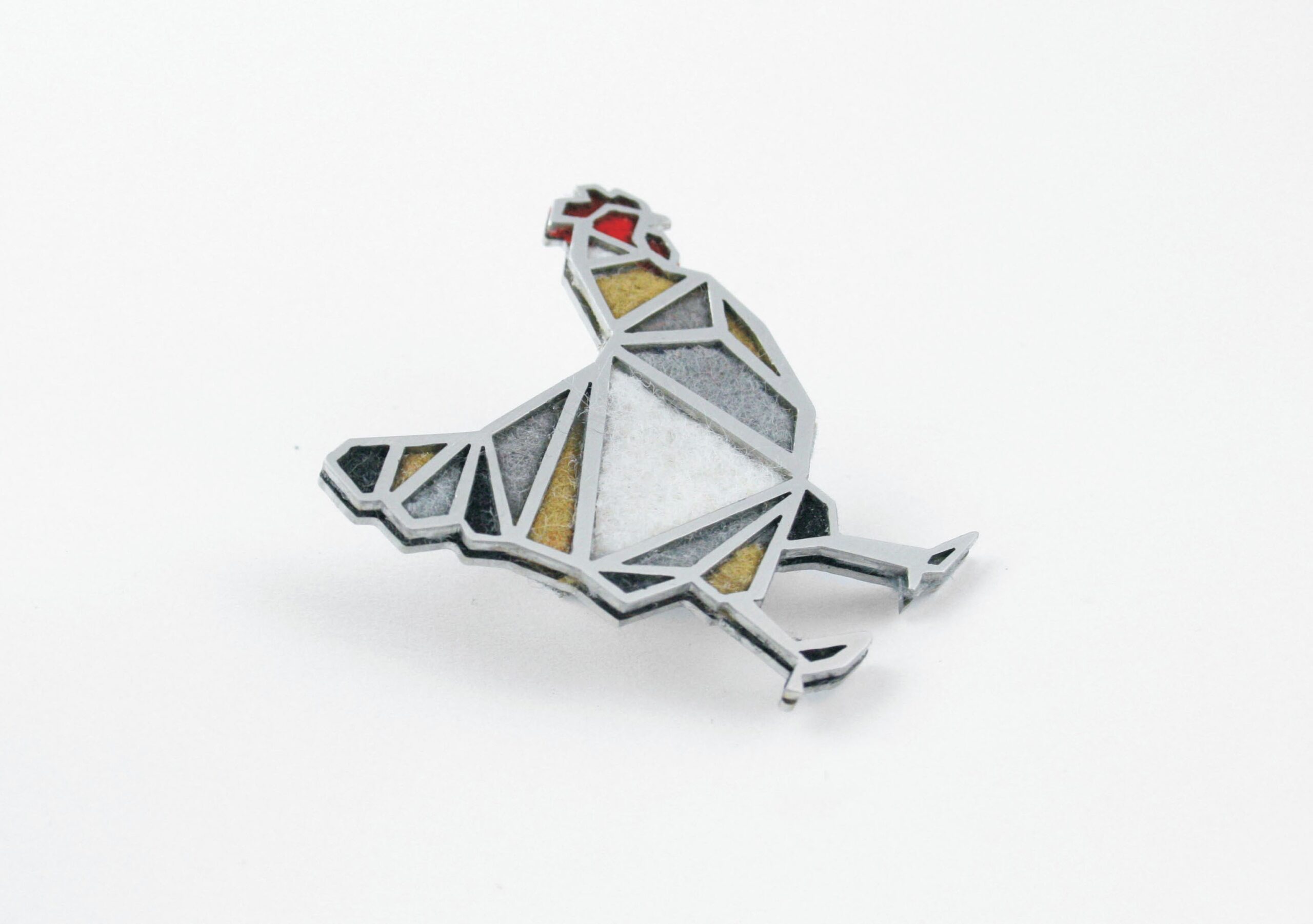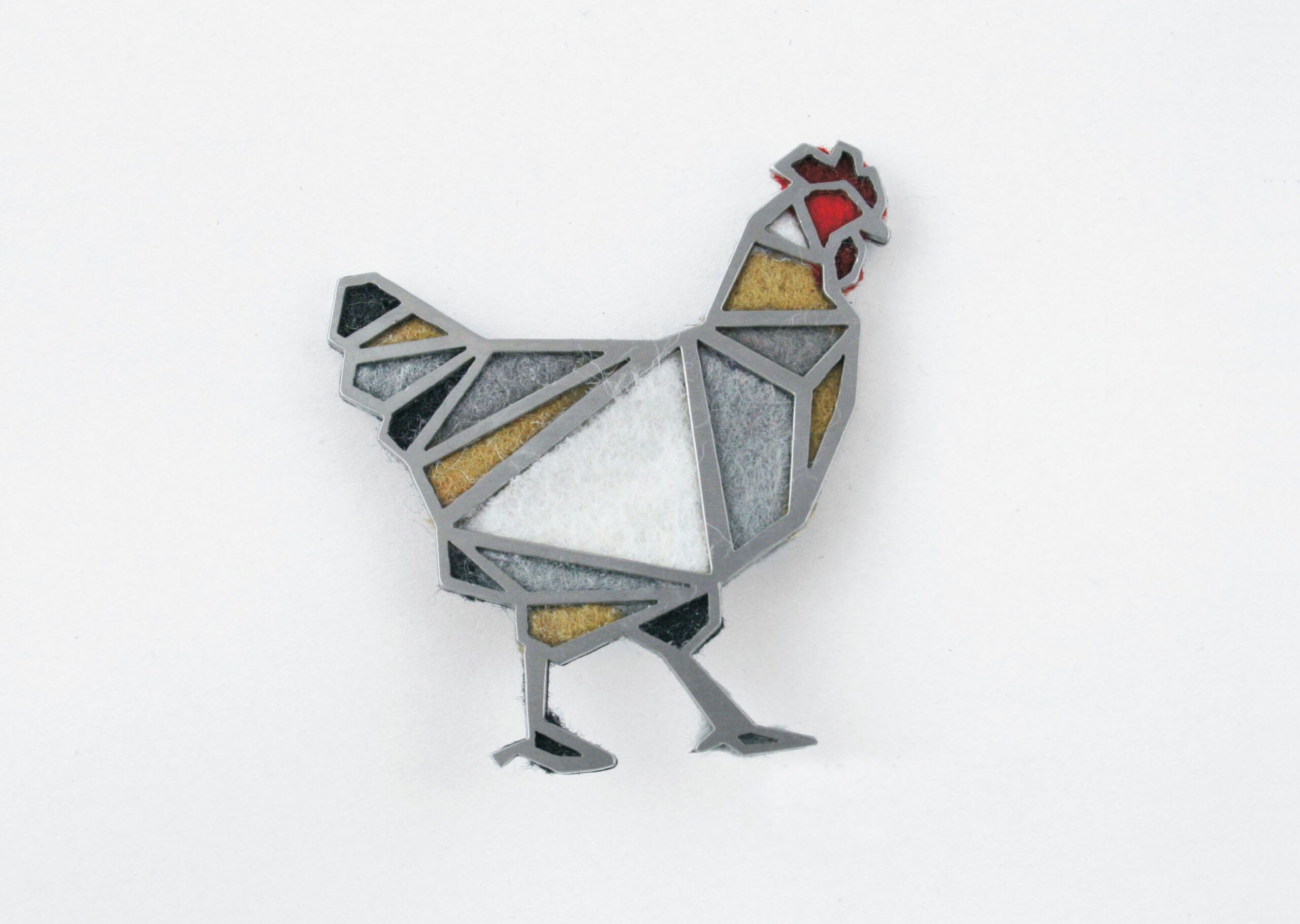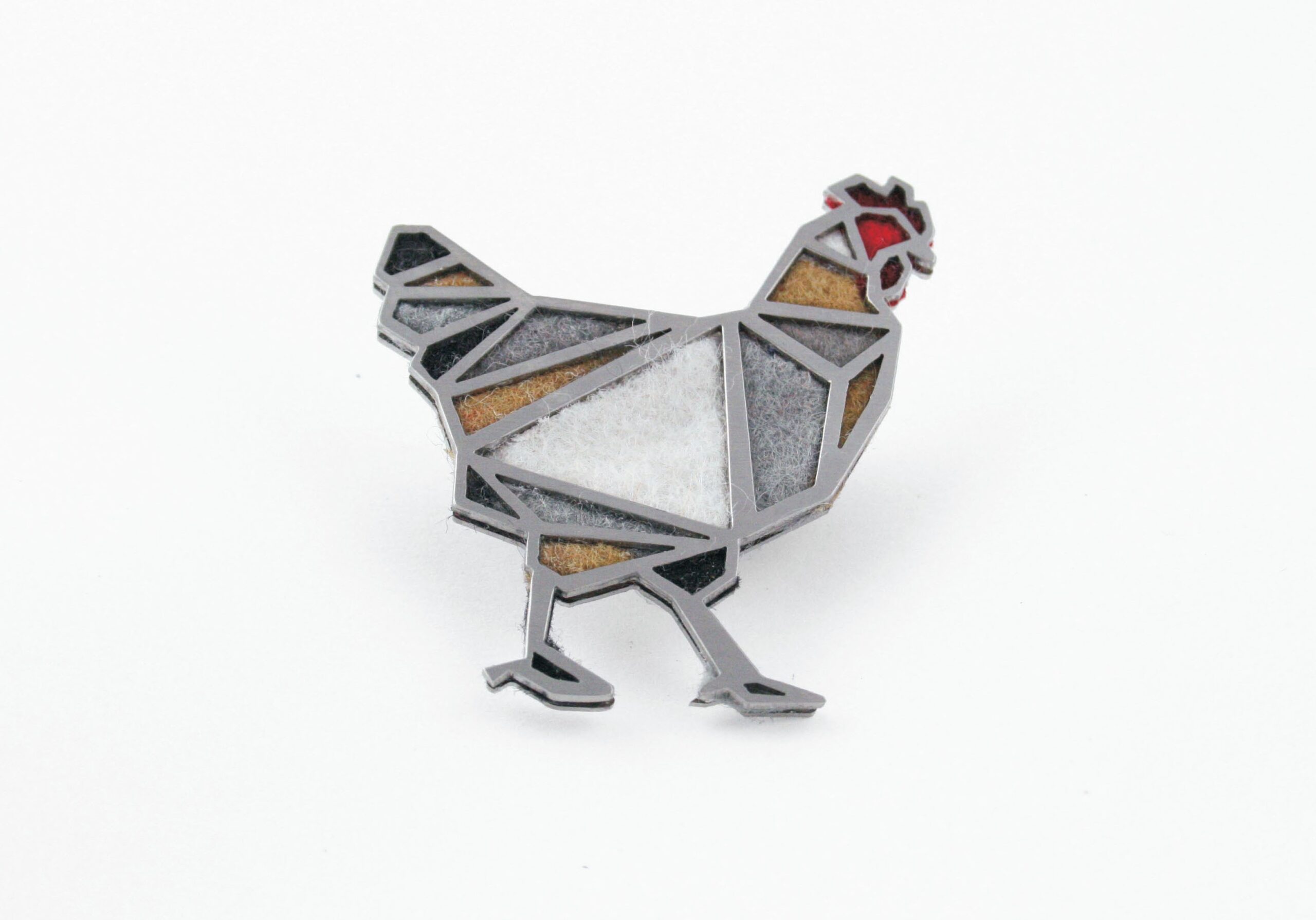Brož je vyrobena z broušeného nerezu a filcu, o velikosti 49 x 55 mm, tloušťka 3 mm. Barevná kombinace může být i na přání.