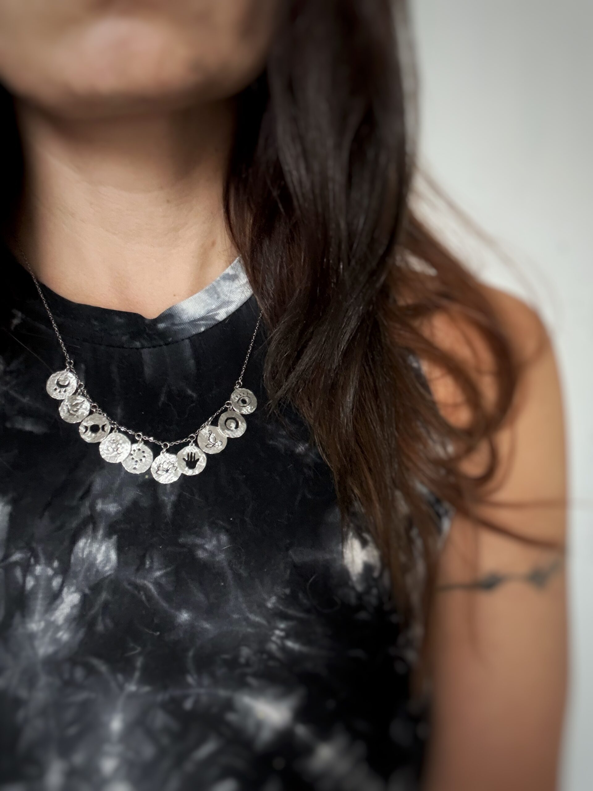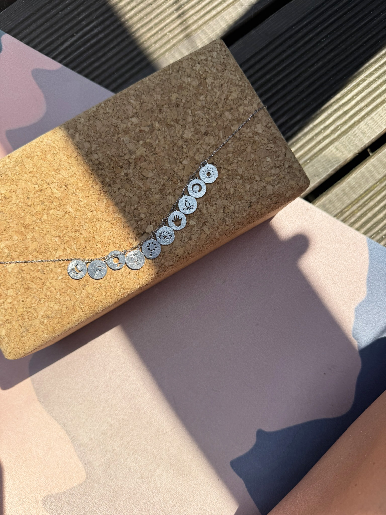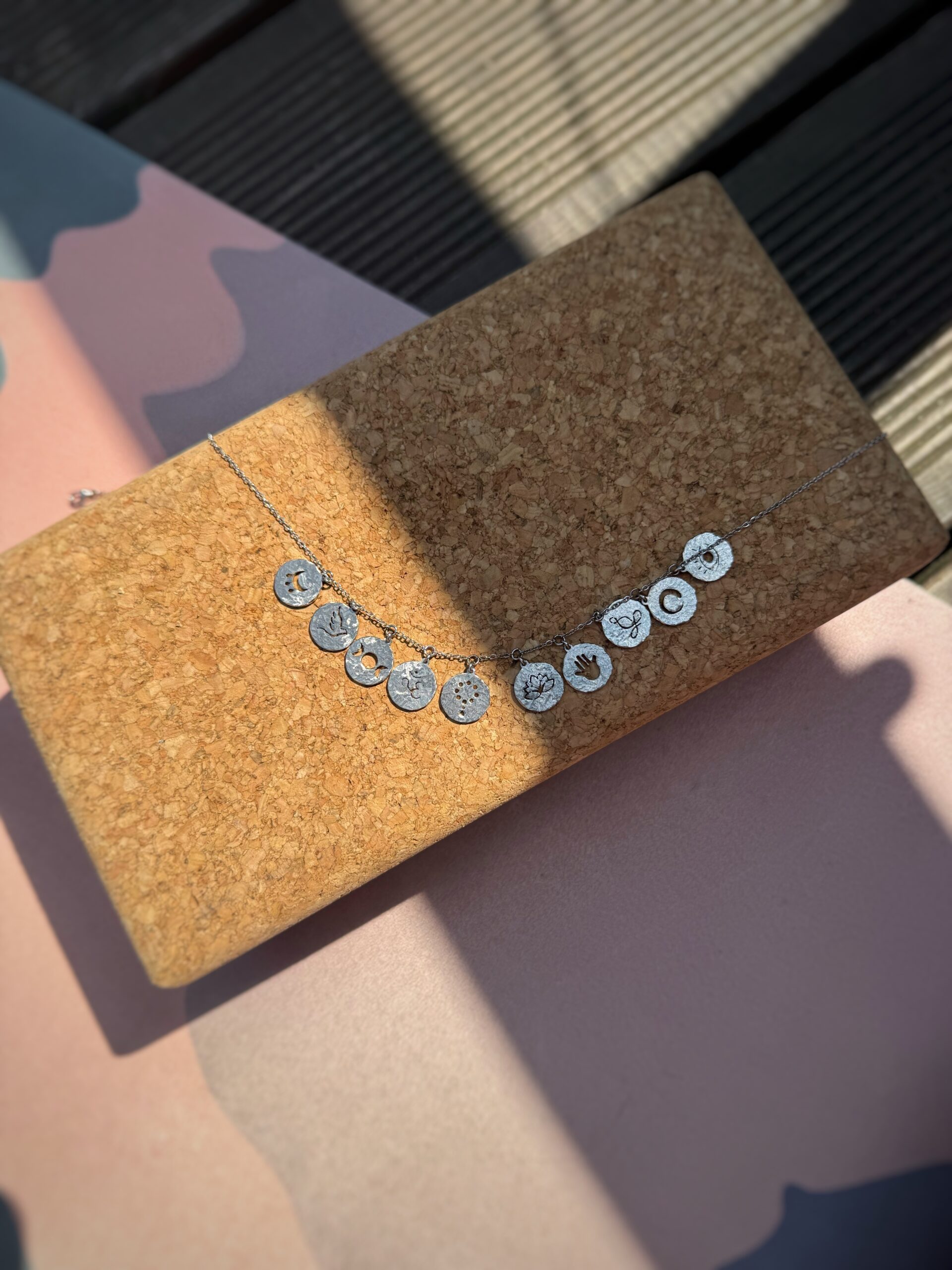Náhrdelník je jako symbol návratu sama k sobě. Jako připomínka, že odpovědi nejsou venku, ale uvnitř nás. Budeš se s ním cítit dokonalá taková jaká právě teď jsi. Náhrdelník je vyrobený z nerezové broušené oceli, celková délka je 46 cm (nebo na přání). Nerezová ocel je materiál, který se vyznačuje hlavně svou pevností, stálostí a houževnatostí. Její hlavní výhoda však je, že se jedná o antialergenní materiál, proto se nemusíte bát podráždění kůže nebo alergických reakcí.