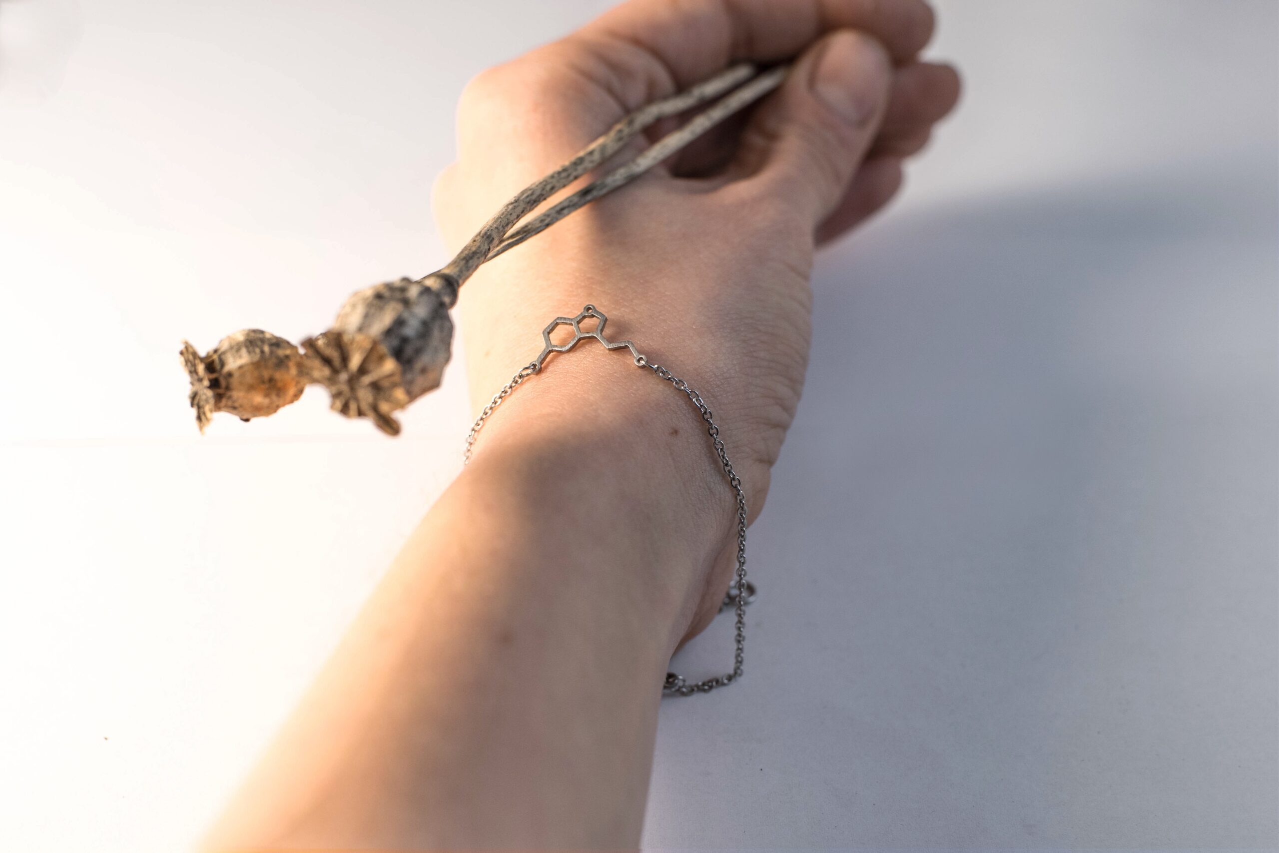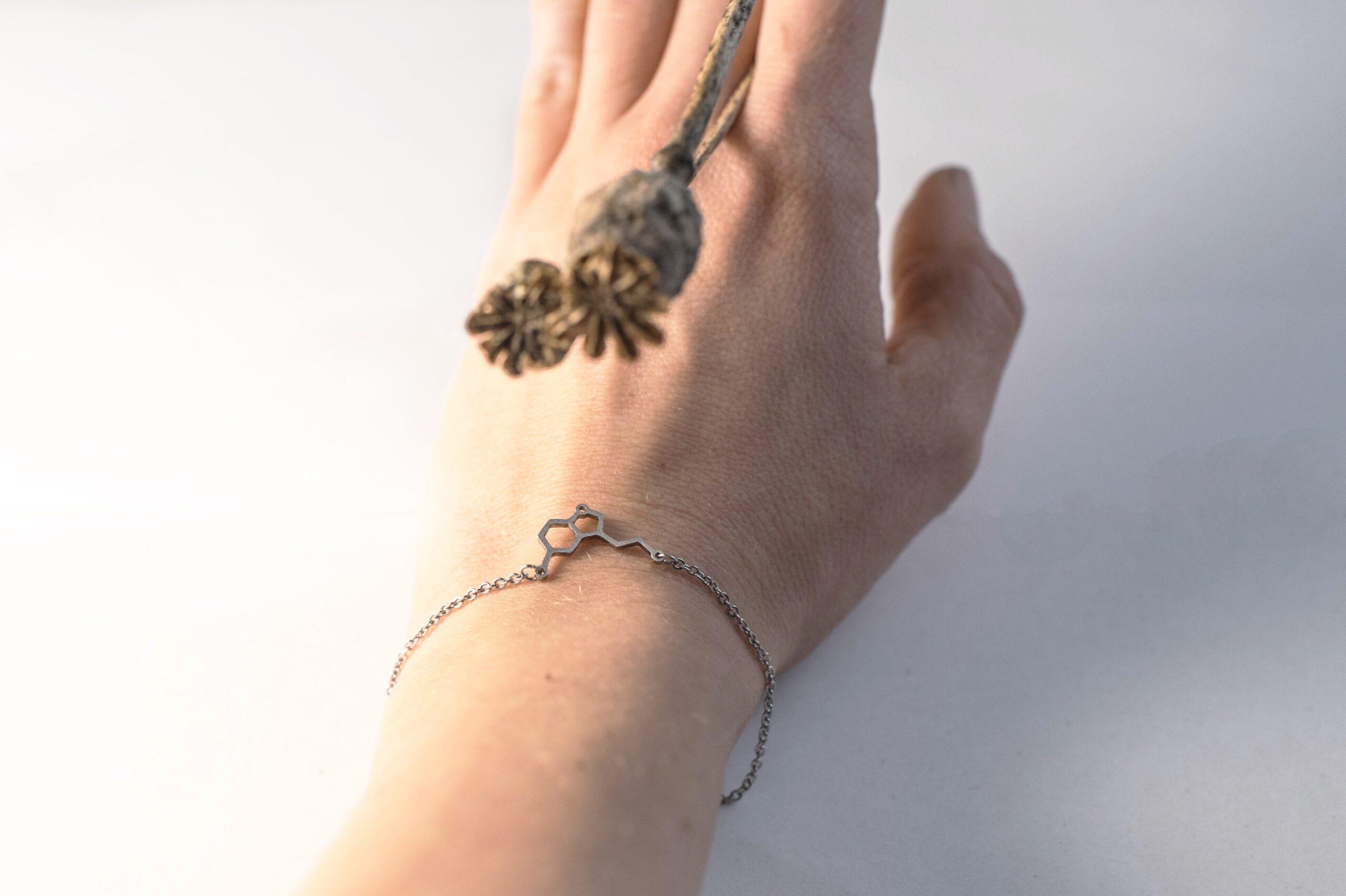 Náramek serotonin, hormon štěstí a radosti, je vyrobený z broušené nerezové oceli. Nerezová ocel je materiál, který se vyznačuje hlavně svou pevností, stálostí a houževnatostí. Její hlavní výhoda však je, že se jedná o antialergenní materiál, takže se nemusíte bát alergických reakcí. Velikost přívěšku 2 x 1 cm. Délka řetízku, 16, 18 a 20 cm (tři volitelné délky), nebo na přání. Ukončen pomocí zapínání na karabinku.